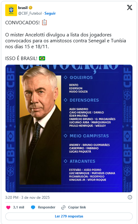 O técnico Carlo Ancelotti convocou a seleção brasileira masculina de futebol nesta segunda-feira (3) para os dois últimos amistosos de 2025, contra Senegal e Tunísia, nos dias 15 e 18 respectivamente, na Europa. As duas equipes já estão asseguradas na Copa do Mundo de 2026.