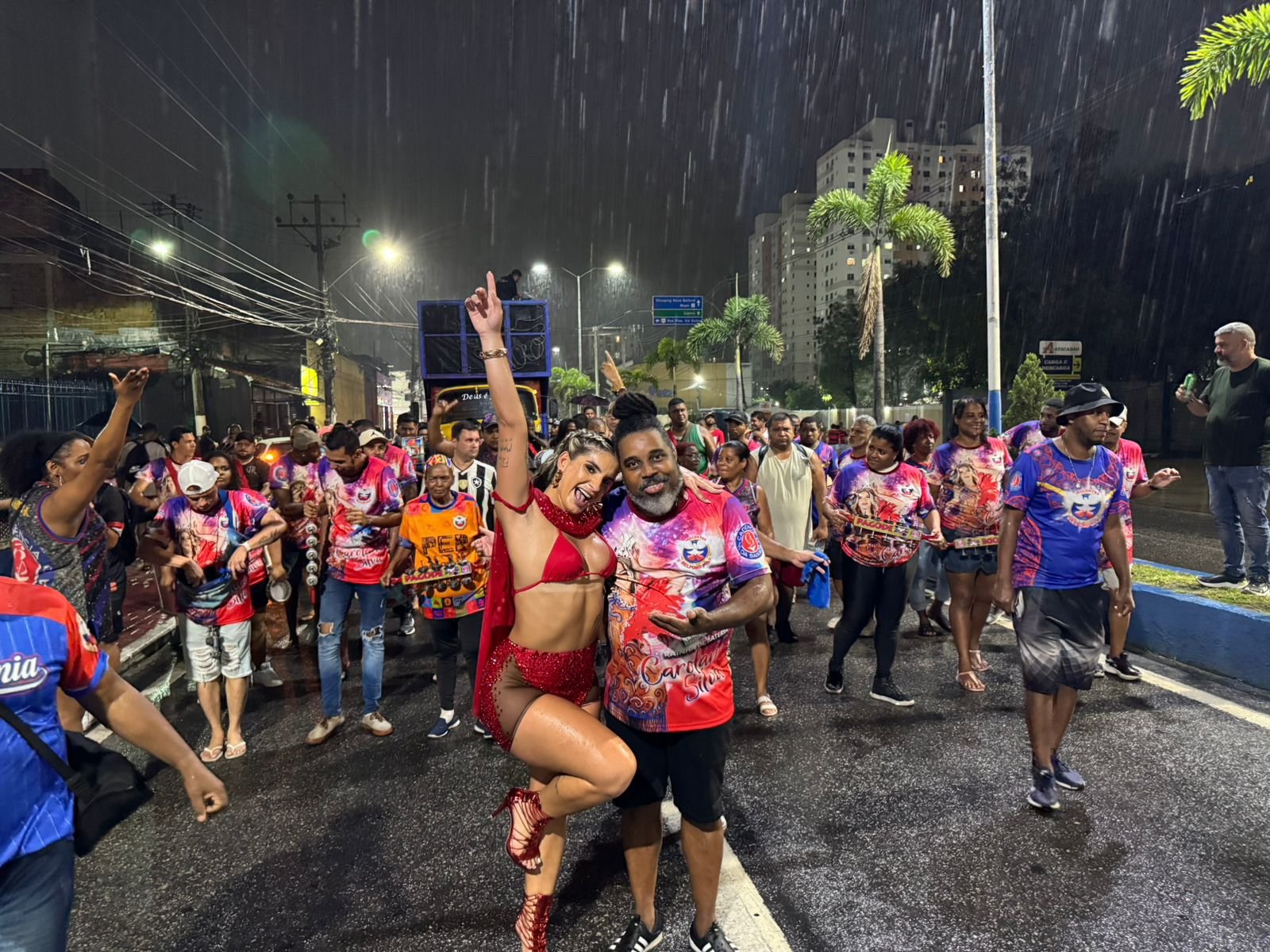 Debaixo de chuva, rainha de bateria riscou o chão usando shortinho e cropped vermelho, mostrando…
