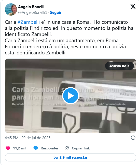 “Carla Zambelli está em um apartamento em Roma. Dei o endereço à polícia, e a polícia já está identificando Zambelli”, publicou Bonelli na rede X.