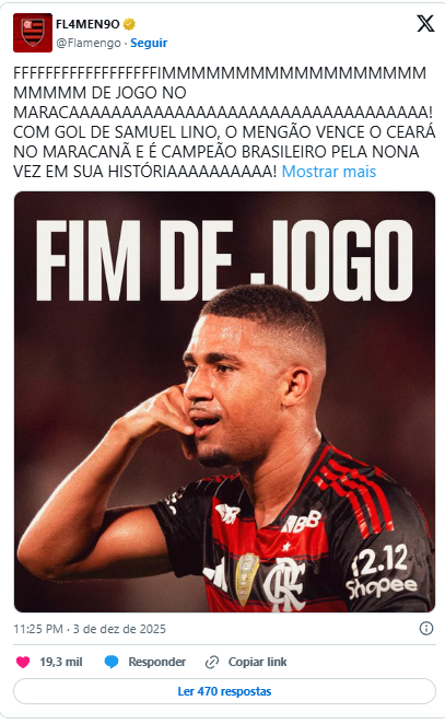 Com um gol do atacante Samuel Lino, o Flamengo derrotou o Ceará por 1 a 0 para garantir o título do Campeonato Brasileiro, na noite desta quarta-feira (3) no estádio do Maracanã, no Rio de Janeiro. A conquista coroa uma temporada histórica, na qual a equipe também garantiu os títulos da Supercopa do Brasil, do Campeonato Carioca e da Copa Libertadores da América.