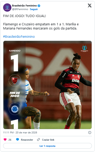 Flamengo e Cruzeiro ficaram no empate de 1 a 1, na noite desta sexta-feira (20) no estádio Luso-Brasileiro, no Rio de Janeiro, na partida que marcou a abertura da 4ª rodada da Série A1 do Campeonato Brasileiro de futebol feminino.