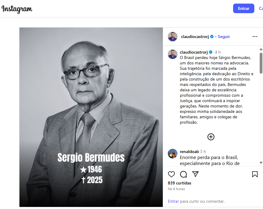 “O Brasil perdeu hoje Sérgio Bermudes, um dos maiores nomes na advocacia. Sua trajetória foi marcada pela inteligência, pela dedicação ao Direito e pela construção de um dos escritórios mais respeitados do país. Bermudes deixa um legado de excelência profissional e compromisso com a Justiça, que continuará a inspirar gerações. Neste momento de dor, expresso minha solidariedade aos familiares, amigos e colegas de profissão”, postou o governador no seu perfil, no Instagram.