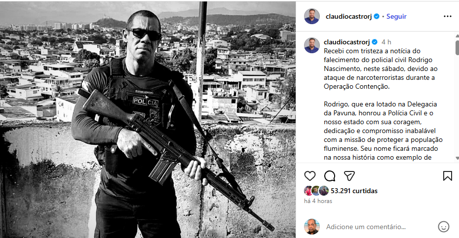 “Recebi com tristeza a notícia do falecimento do policial civil Rodrigo Nascimento, neste sábado, devido ao ataque de narcoterroristas durante a Operação Contenção.