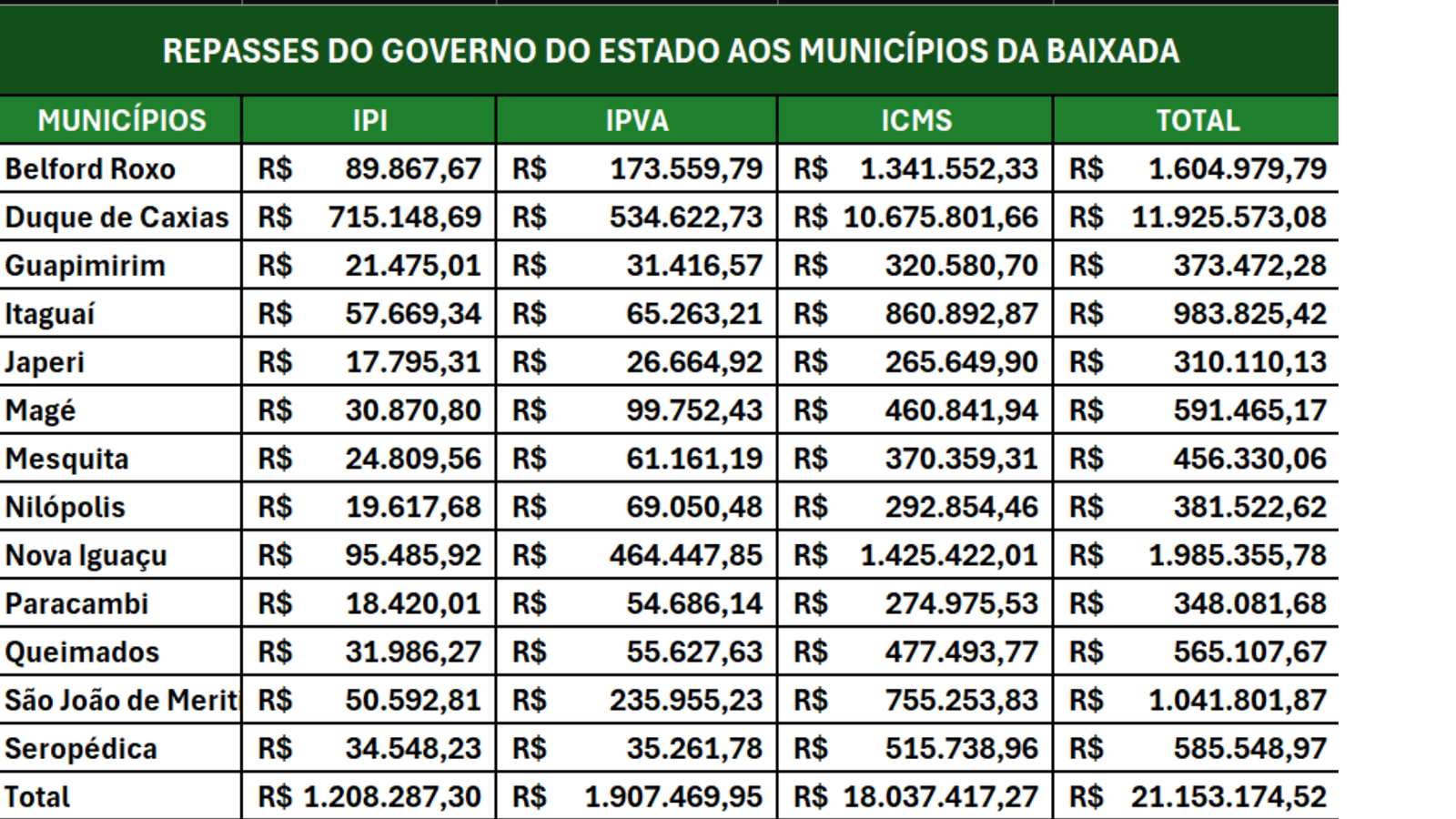 O Governo do Estado repassou nesta semana R$ 133 milhões para os 92 municípios fluminenses. O depósito feito pela Secretaria de Fazenda refere-se ao montante arrecadado no período de 20 a 24 de outubro. Os valores correspondem à distribuição de parte da arrecadação dos tributos IPI, ICMS e IPVA às administrações municipais.