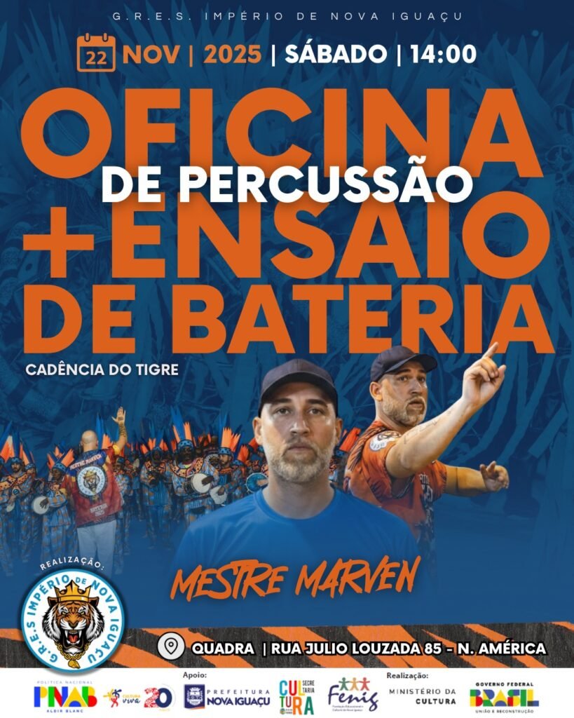 O Império de Nova Iguaçu realiza, no próximo dia 22 de novembro de 2025 (sábado), mais uma edição do seu Workshop gratuito de Percussão, seguido do tradicional ensaio da Cadência do Tigre. O encontro acontece a partir das 14h, na quadra da agremiação, localizada na Rua Júlio Louzada, 85 – Nova América, Nova Iguaçu.