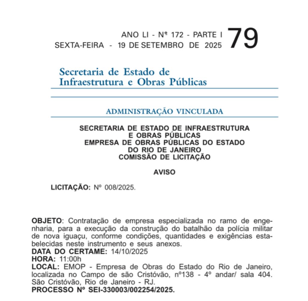 A licitação para contratar a empresa responsável pela construção do batalhão da Polícia Militar de Nova Iguaçu será realizada no dia 14 de outubro, conforme publicação no Diário Oficial. A notícia foi anunciada pelo deputado estadual Carlinhos BNH (PP), em encontro com o presidente da Empresa de Obras Públicas do Estado do Rio de Janeiro (EMOP), André Braga, que confirmou o início da obra no mesmo mês.