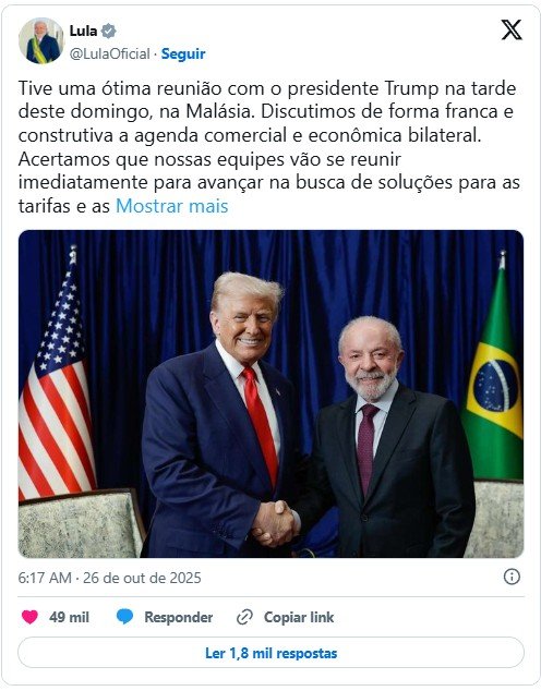 “Tive uma ótima reunião com o presidente Trump na tarde deste domingo, na Malásia. Discutimos de forma franca e construtiva a agenda comercial e econômica bilateral. Acertamos que nossas equipes vão se reunir imediatamente para avançar na busca de soluções para as tarifas e as sanções contra as autoridades brasileiras”, disse Lula.
