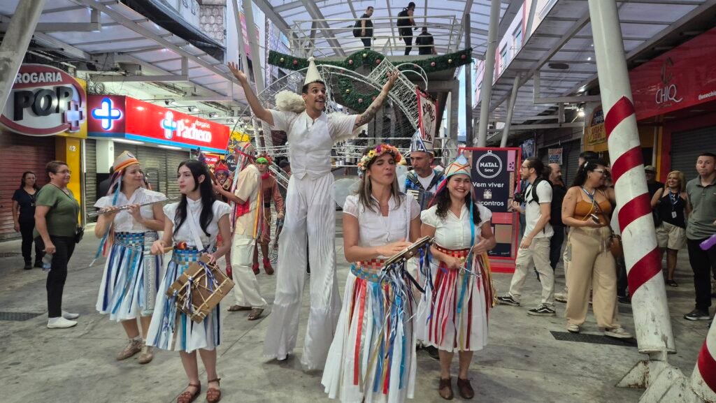 Da Praça do Chafariz, o prefeito seguiu para o calçadão da Avenida Mirandela, onde já era esperado pelo cortejo brincante Arteira de teatro de Nova Friburgo. O grupo fez uma homenagem à cultura natalina brasileira, com cânticos e danças.