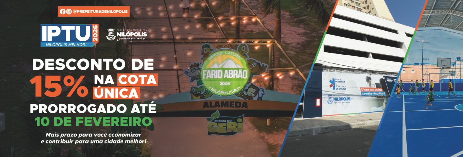 A Prefeitura de Nilópolis, por meio da Secretaria Municipal de Fazenda, informa que o prazo para pagamento do Imposto Predial e Territorial Urbano (IPTU) 2026 em cota única, com desconto de 15%, foi prorrogado até o dia 10 de fevereiro.