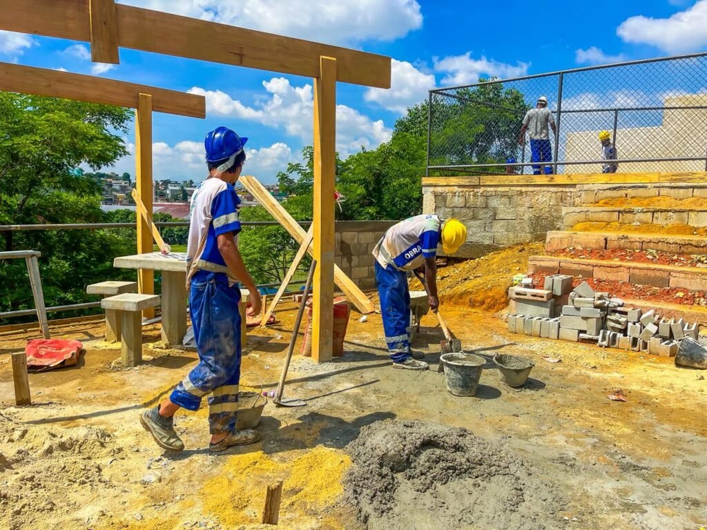 Funcionários trabalham na área de vivência e o playground, que ficará acima com cerca