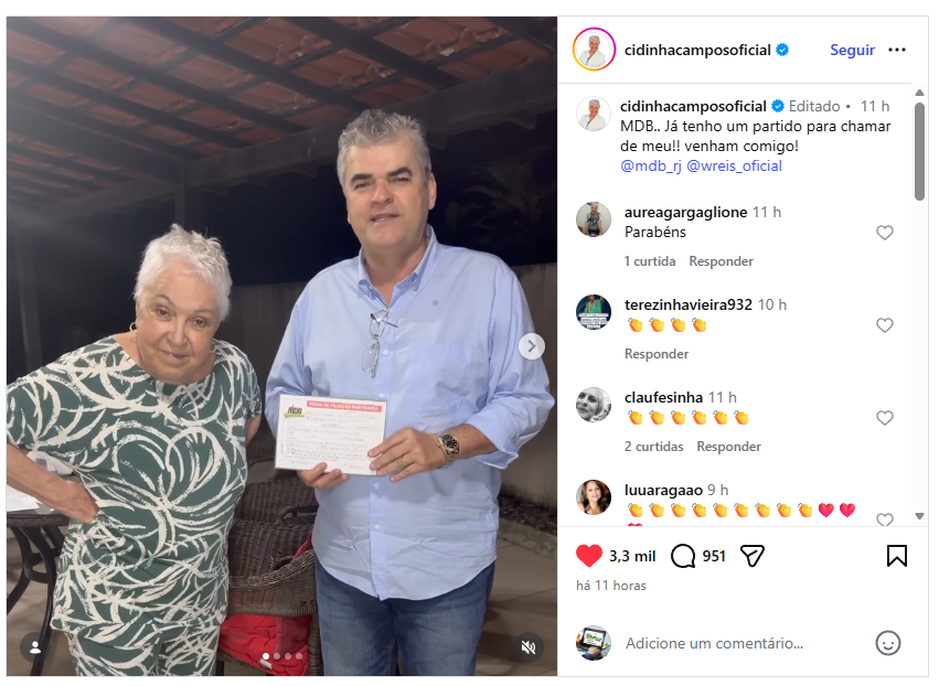 Poucas horas depois, o cenário político já apresentava novos contornos. O presidente regional do MDB no Rio de Janeiro, Washington Reis, anunciou, com entusiasmo, a filiação de Cidinha Campos à legenda.