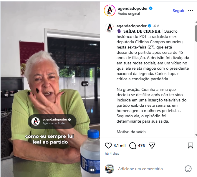 A decisão de deixar o PDT, ainda que dolorosa, também revela coerência com a trajetória de quem nunca aceitou o silêncio diante do que considera injusto. Aos 83 anos, Cidinha Campos segue ativa, combativa e fiel a um princípio que norteou toda a sua vida pública: o respeito.