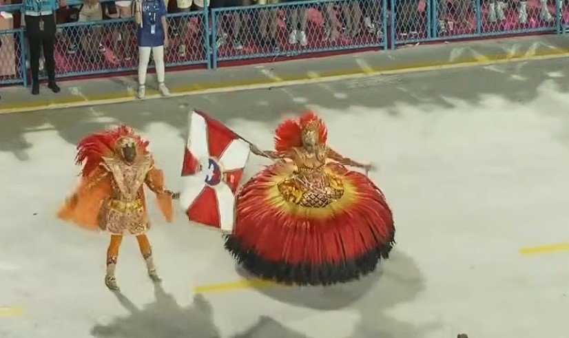 O primeiro casal, Vinicius Jesus e Thainá Teixeira, apresentou bailado clássico, rodopios equilibrados e sincronia elegante, defendendo o pavilhão com segurança.