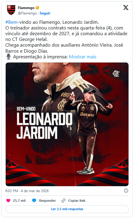 O Flamengo anunciou, nesta quarta-feira (4), que contratou o técnico Leonardo Jardim. O português, que comandou o Cruzeiro em 2025, chega para substituir Filipe Luís, que foi demitido na madrugada da última terça-feira (3) após a goleada por 8 a 0 sobre o Madureira, pelas semifinais do Carioca.