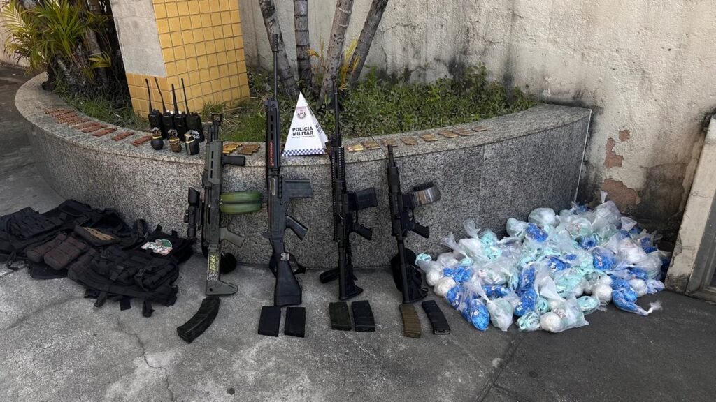 Durante a operação, quatro homens foram presos. Os agentes apreenderam quatro fuzis, três granadas, quatro rádios transmissores e drogas.